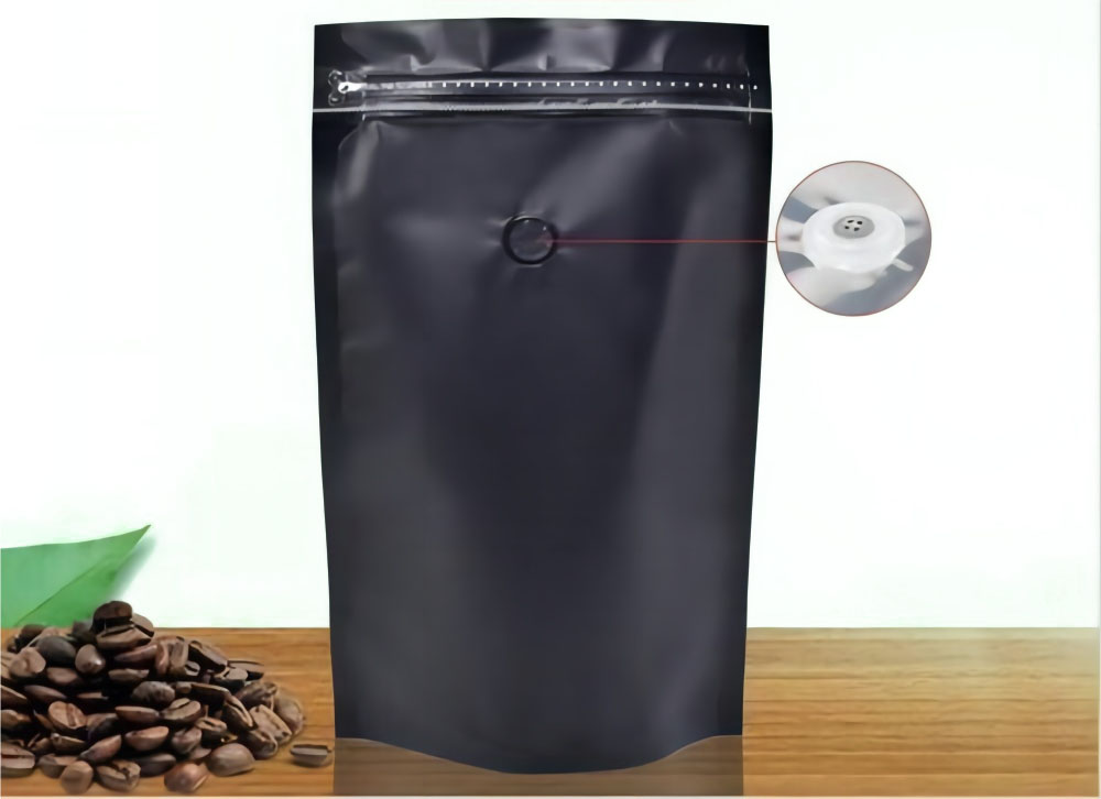 铝箔纸包装袋能够起到挡光、隔绝高温的效果,单向气阀能够阻挡外部空气进入包装袋中,同时也能将咖啡豆中多余的二氧化碳排出,如图1-3-2所示。