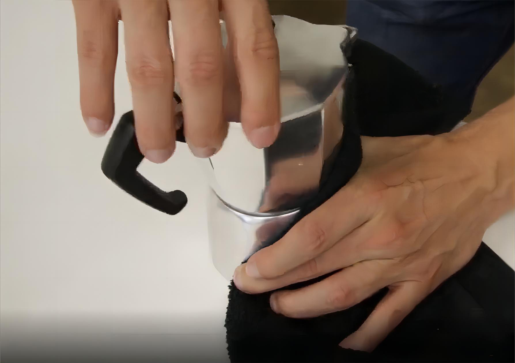 图3-8-10 关闭火源,将摩卡壶放置于湿毛巾上