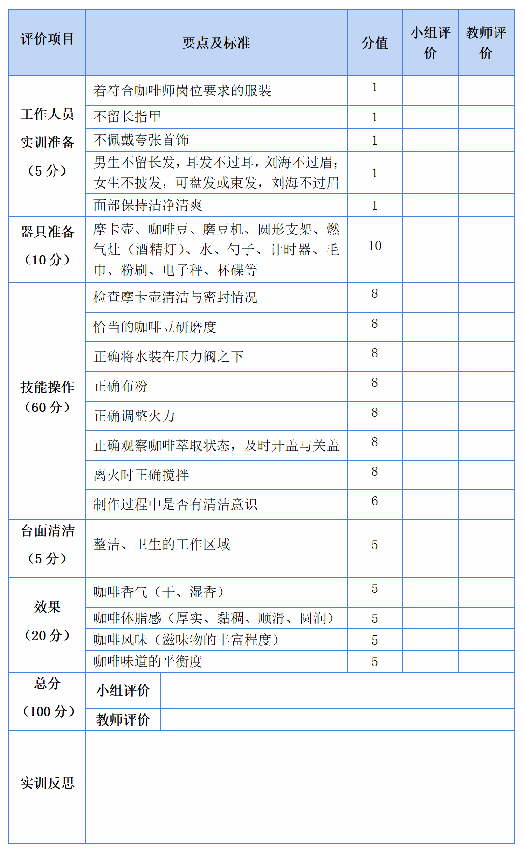 表3-8-1 摩卡壶冲煮咖啡实训评价表