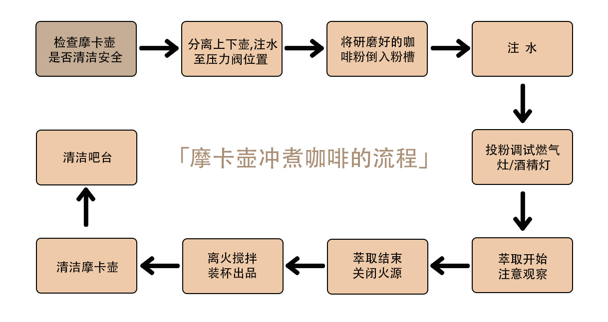 使用摩卡壶冲煮咖啡的流程,如图3-8-4所示。