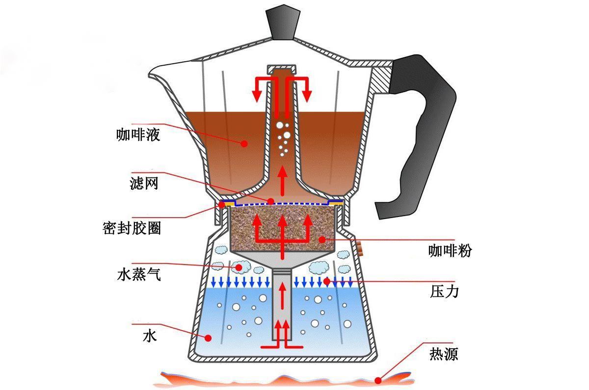 摩卡壶的工作原理简单来说就是通过加热下壶中的水变成蒸汽,利用蒸气的压力将水推升至导管进入粉槽而萃取咖啡液,再继续通过导管推升到上壶聚合流出,如图3-8-3所示。