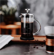 代表器具为法压壶。法压壶采用浸泡式过滤法进行萃取,粗研磨可以使萃取出的咖啡油脂与芳香物质可以顺利通过滤网,同时防止咖啡渣从滤孔中穿过。如图3-3-9所示。