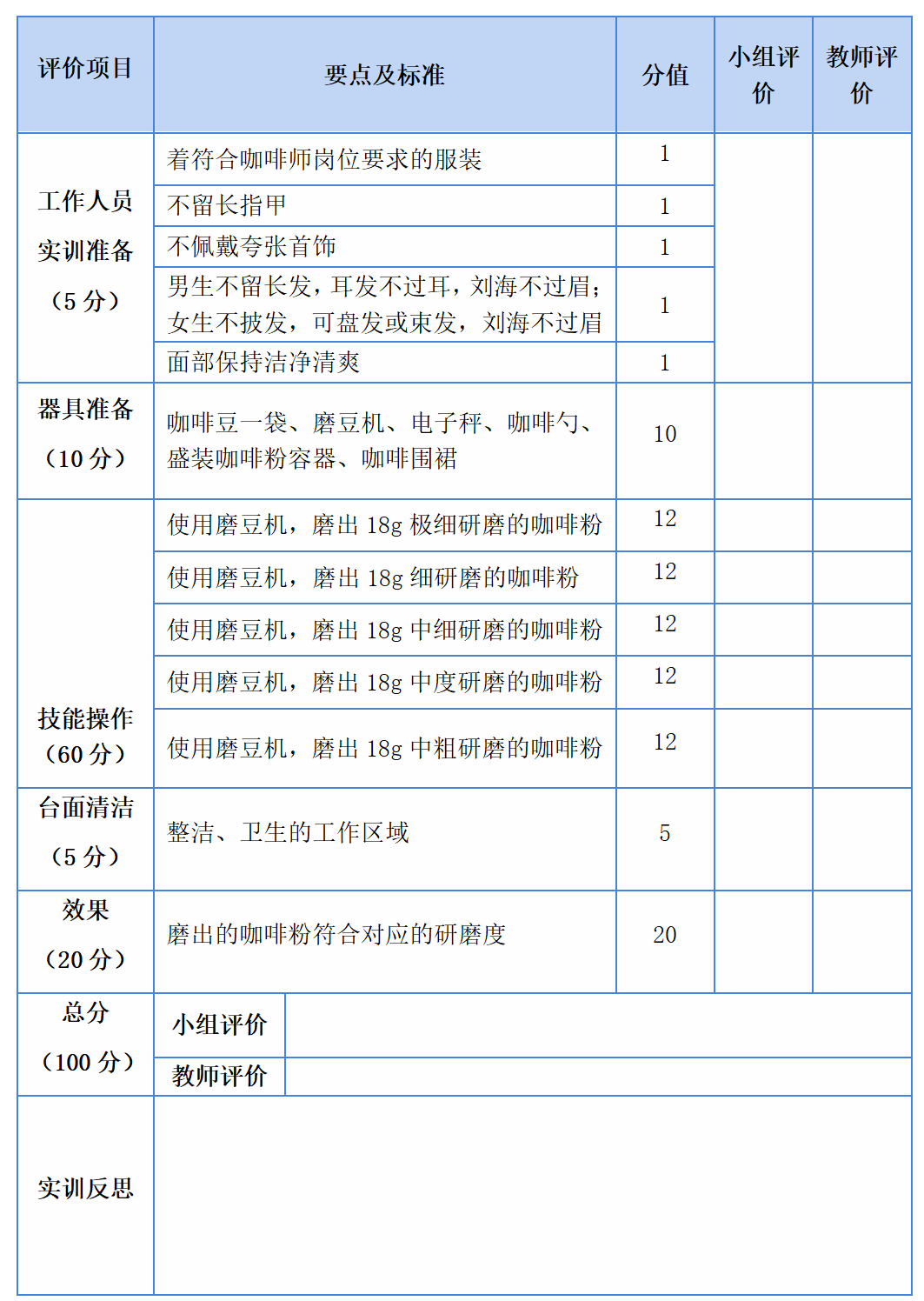 表3-1-1 磨咖啡粉实训评价表