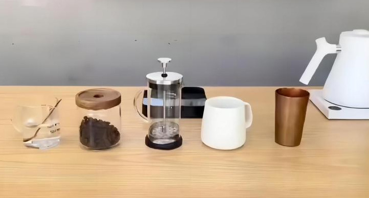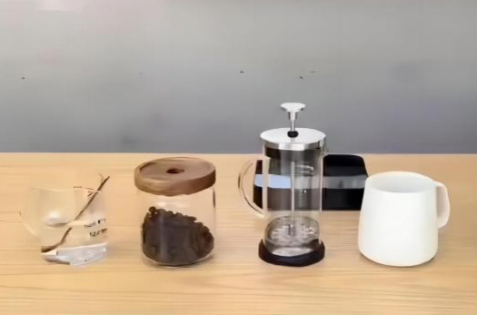 (1)器具及材料准备:法式滤压壶、咖啡豆、磨豆机、咖啡杯、豆勺、搅拌棒、计时器、热水壶、毛巾、电子秤、温度计、杯碟、废水桶、热水。