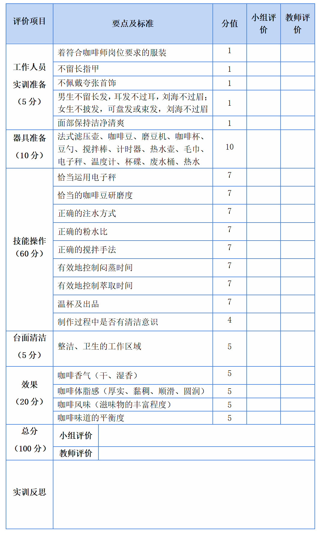 表3-6-1 法压壶冲煮咖啡实训评价表