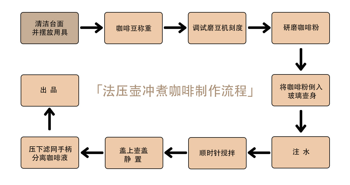 使用法式滤压壶冲煮咖啡的流程,如图3-6-3所示。