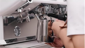 打开蒸汽管,先空喷喷嘴,再把蒸汽管放入不锈钢奶缸,这样既可以预热蒸汽管,又可以将管内蒸汽凝结的水滴冲掉。在打开蒸汽开关打发奶泡时,注意不要开得过大,否则牛奶泡沫尚未形成牛奶就已沸腾,导致打出的泡沫较少;同样也不能开得太小,蒸汽不足也会打不出泡沫。