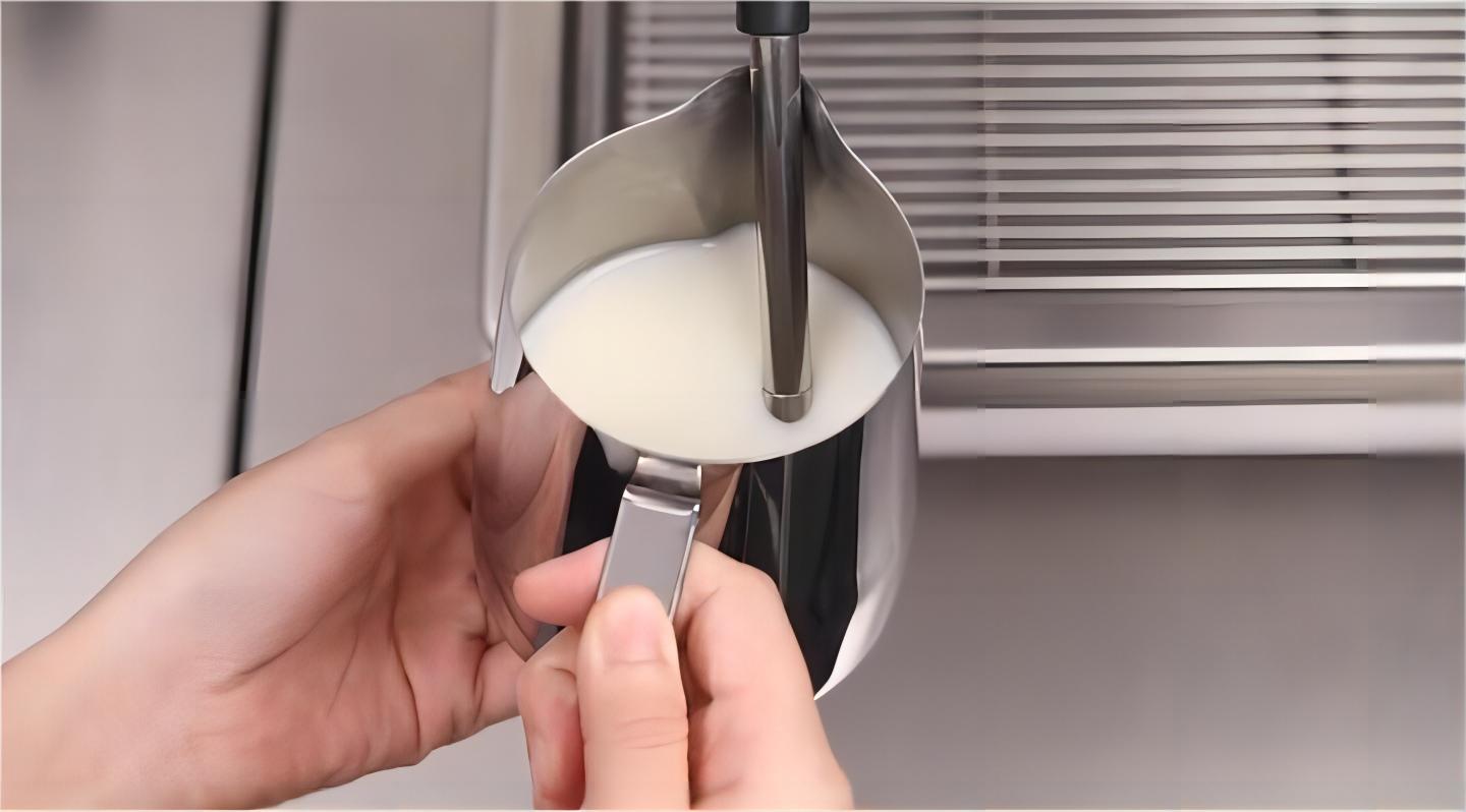 在打发奶泡时,刚开始会听到 “嘶嘶” 的声音,当牛奶温度达到温热时,漩涡将明显出现在牛奶表面,奶泡量同步上升,此时注意要降低奶缸的位置,使喷嘴头插入牛奶的深度始终保持在0.7厘米,这样做的目的是将奶泡打得更加绵密。直到打发的奶泡升至奶泡壶的九分满或温度达到60℃~70℃时就可以了。如果发出的声音特别刺耳,则表示牛奶打发错误。