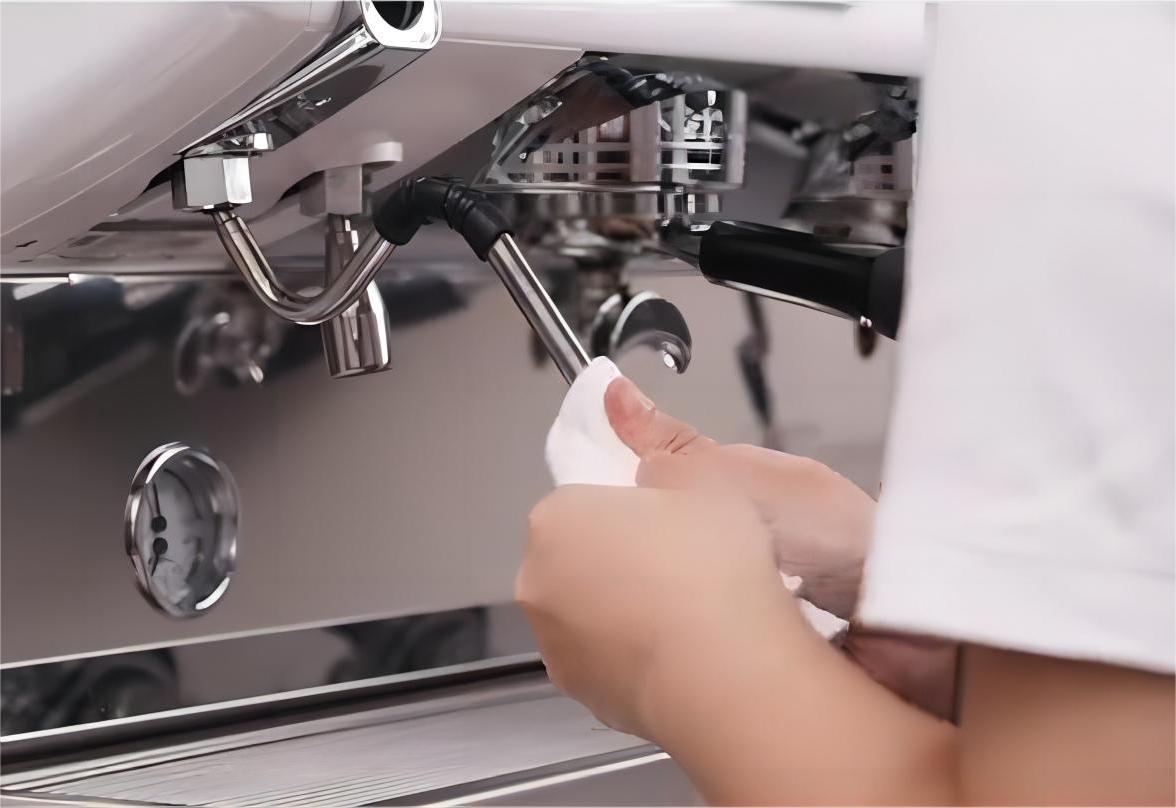 步骤8:清洁蒸汽棒。用干净毛巾清洁蒸汽棒,释放几秒钟蒸汽以清除蒸汽棒及喷嘴内残留的牛奶,如图4-2-16所示。
