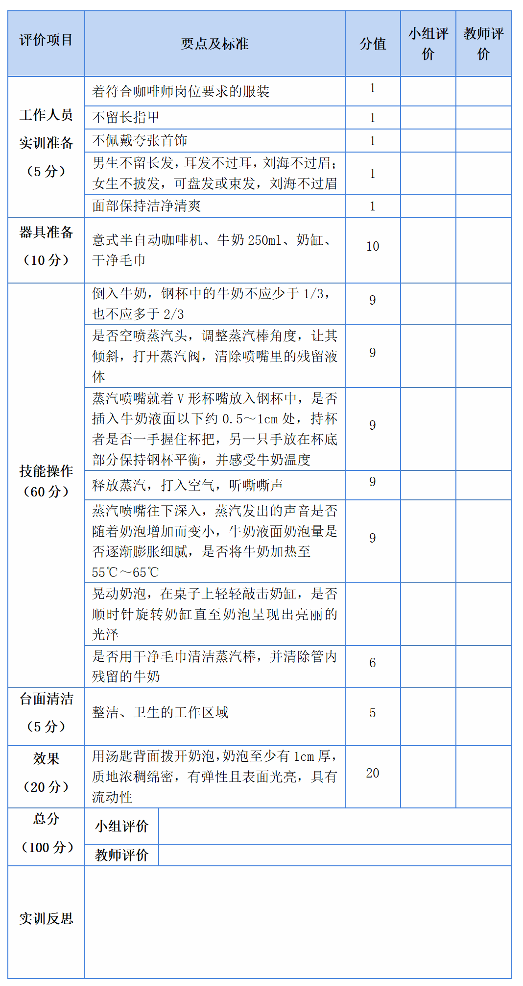 分小组使用意式半自动咖啡机制作奶泡,完成评价表4-2-1。