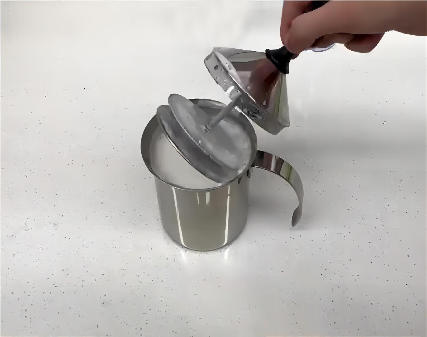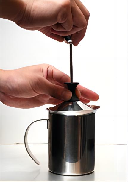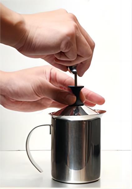 ③将盖子和滤网盖上,快速抽动滤网将空气压入牛奶中,只要在牛奶表面做动作即可,尽量不要打到底和拉到顶;抽动的次数在30下左右即可,不过打的频率要快,牛奶要宁软勿硬形成泡沫,如图4-2-2、4-2-3所示。