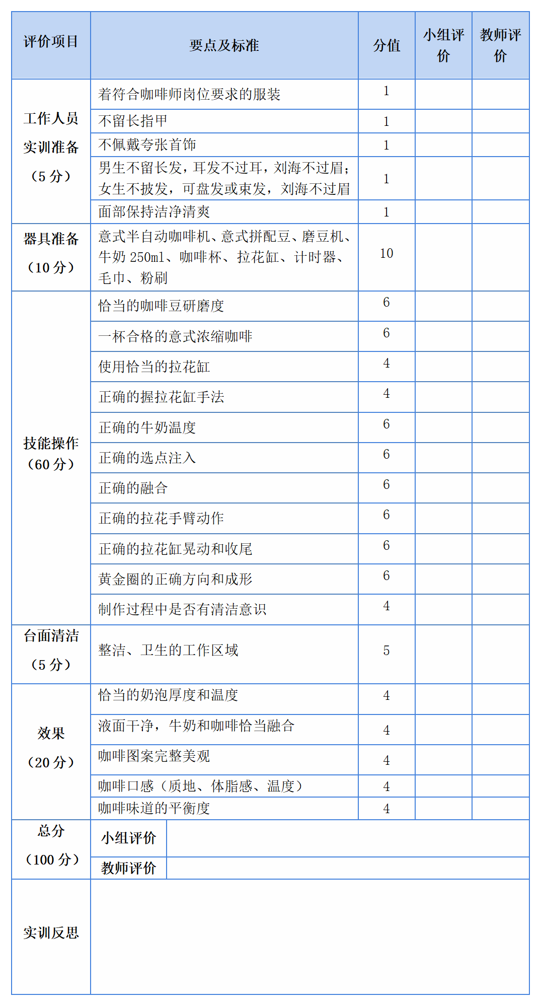 分小组使用意式半自动咖啡机制作卡布奇诺咖啡,完成评价表4-4-1。