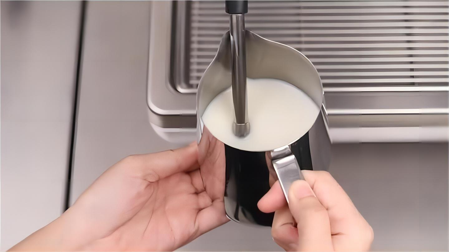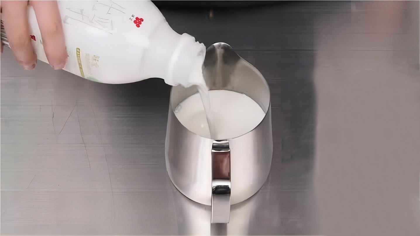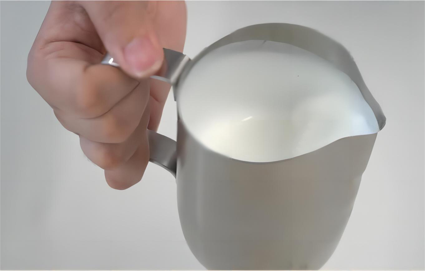 ②将牛奶放入拉花缸中,打成绵密奶泡。