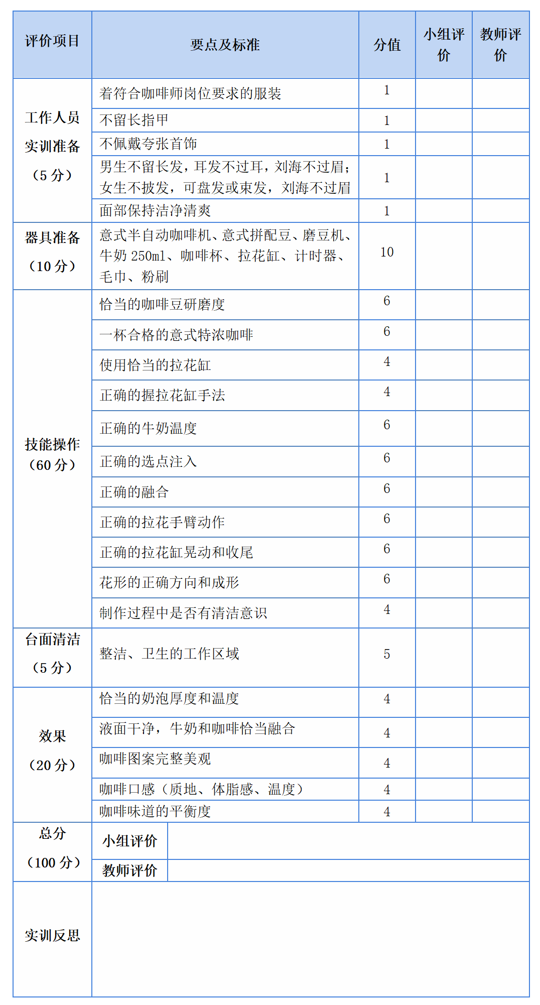 分小组使用意式半自动咖啡机制作馥芮白咖啡,完成评价表4-5-1。