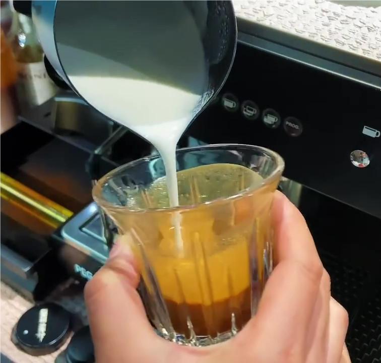 ③将杯子直接放在意式半自动咖啡机下,萃取出20ml特浓咖啡,让浓缩咖啡直接流入牛奶。