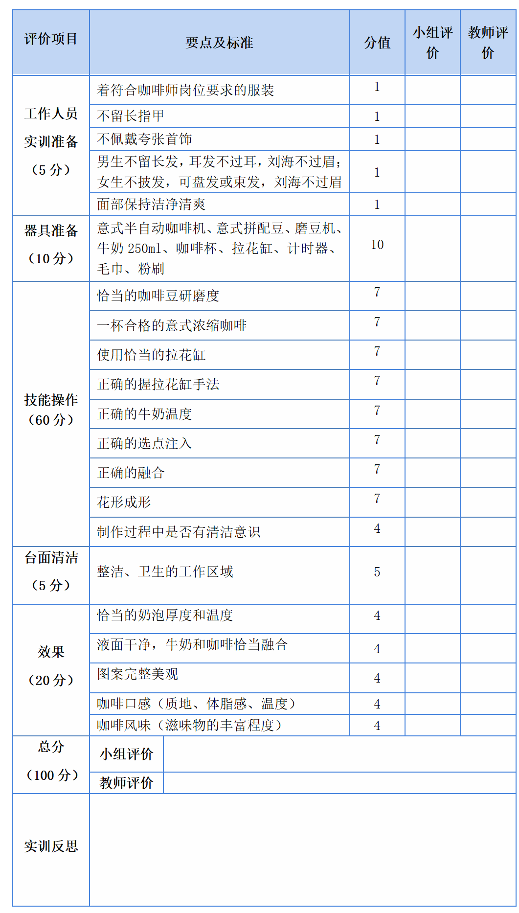 表4-7-1 意式玛奇朵咖啡实训评价表