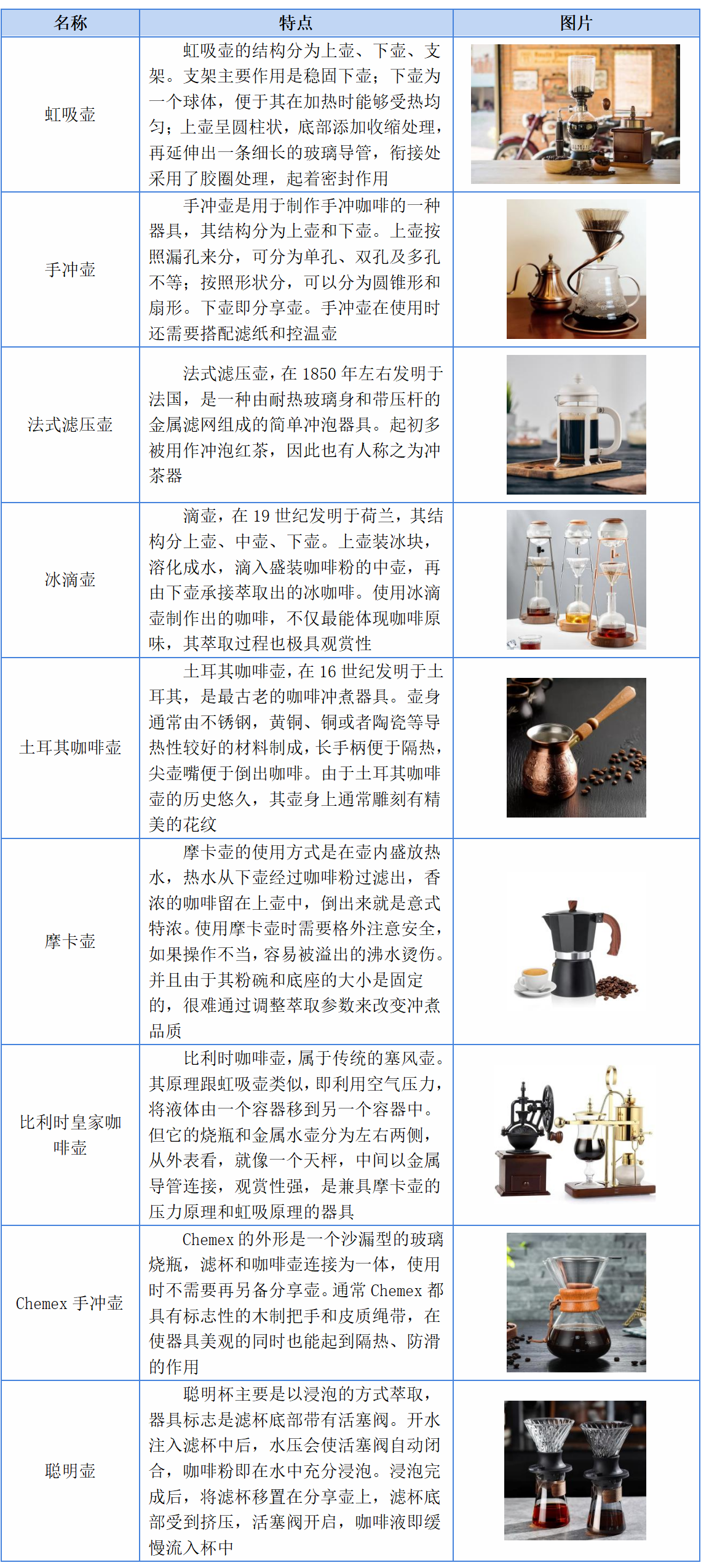 单品咖啡的制作工具及特点,如表3-1-2所示。