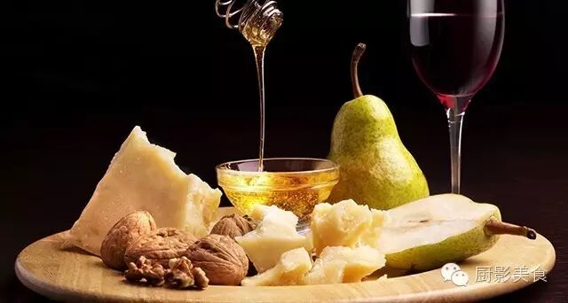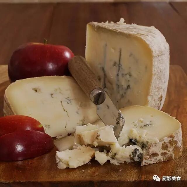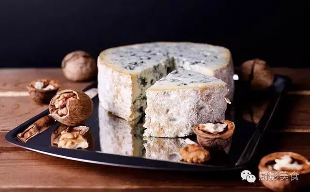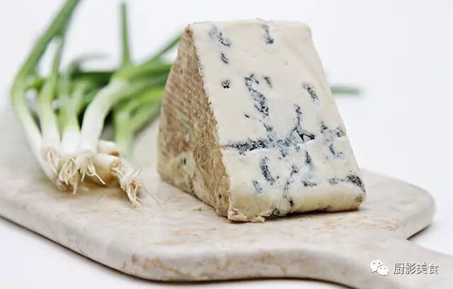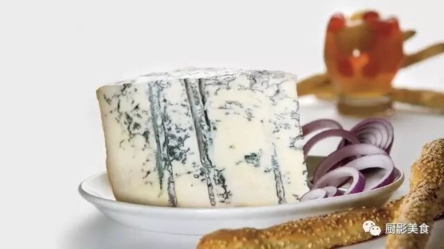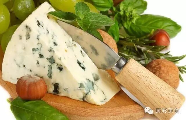 (3)蓝纹奶酪(Blue cheese):质感柔软,主要成分是牛奶或羊奶,经青微菌发酵而成,带有独特的香气,通常带有蓝绿色条纹或斑点,表面呈大理石花纹状,中心部分最美味。配合面包最为经典;配以蜜糖,梨子或苹果可以使奶酪味升华,亦可点缀于沙拉上,皆是至高享受。可以配以醇厚的红酒、甜白葡萄酒、啤酒或威士忌一起享用。