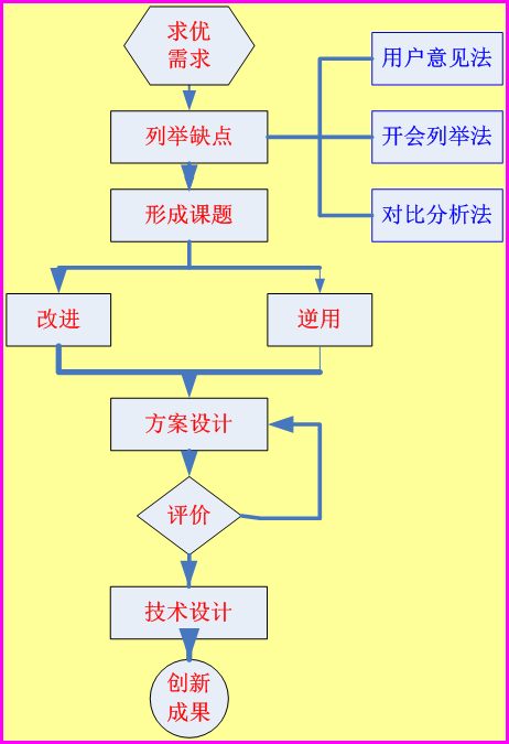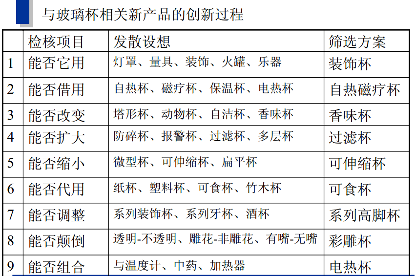 再创型缺点列举是指从工作和生活需要角度出发,发现现有事物具有较大的缺陷,使用极不方便和安全,从而彻底改变事物原有的结构或重新构想,创造一种与原有事物有本质不同的事物的思维方法。