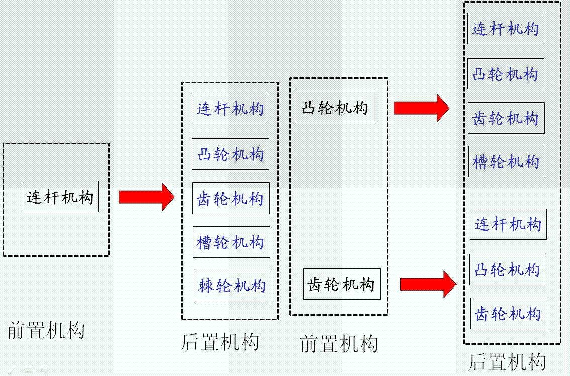 概念:机构的串联组合是指若干个单自由度的基本机构顺序联接在一起。前一个机构称为前置机构,后一个机构称为后置机构。每一个前置机构的输出运动是后置机构的输入。