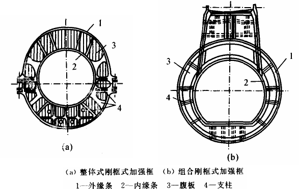 机身隔框(包括普通框)多数是刚框式,这是充分利用机身内部空间。刚框式加强框是由内、外缘条,腹板,支柱等元件组成。根据3种元件的构成情况,刚框可分为组合式、整体式和混合式。