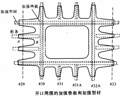 围框式加强:采用井字形加强件组合而成(也可利用机身本身原有的纵向桁条)。组成围框的杆件上将有附加轴力,四周蒙皮上的剪流将增大,应对蒙皮进行局部加强。