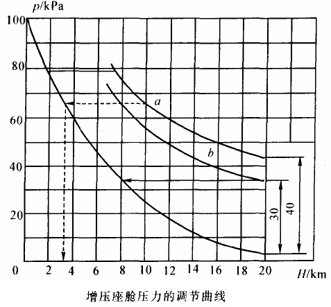 曲线b从3000m开始增压,在7200m以后保持3×104Pa的压差,适用于巡航高度较低的飞机。
