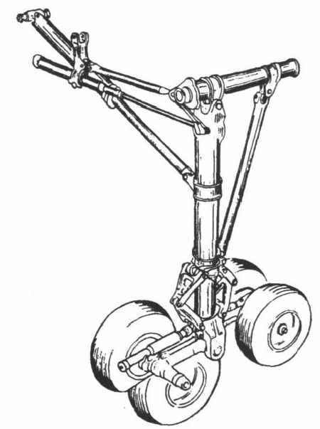 这是广泛应用于重型飞机上的起落架结构形式,这种起落架降低了机轮对跑道的压力。其轮架与支柱的链接必须采用铰接而不能采用固接,而且轮架后部也应能绕支柱转动。