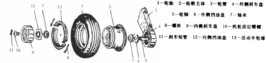 为了便于拆装轮胎,轮毂上装有可拆卸的活动半轮缘,并有防转销以防止半轮缘转动。两个半轮缘在接耳处用螺栓固定,轮毂由铝合金或镁合金制造。机轮每边都装有刹车盘。机轮内装有锥形滚柱轴承,轴承外侧装有挡油装置。机轮置于轮轴上,并由螺帽固定。
