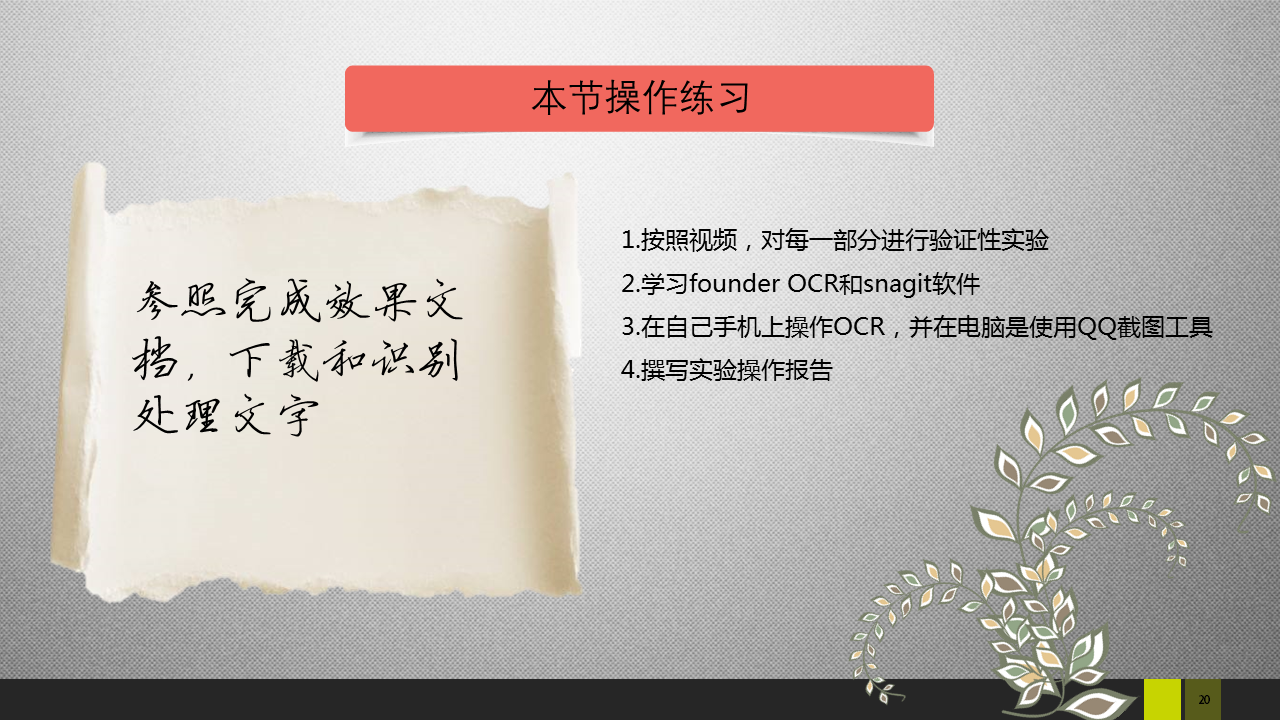 1.不可复制网页链接下载2.选择性粘贴3.pdf文OCR识别4.founder OCR加扫描仪的使用5.snagit软件抓图片、文字、视频等操作6.手机OCR操作使用7.QQ截图工具的使用