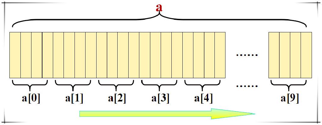 表示定义了一个整型数组,数组名为a,有10个数组元素,为a[0],a[1],a[2],a[3],a[4],a[5],a[6],a[7],a[8],a[9]。系统要为数组a分配4*10=40个字节的存储单元,且这些存储单元是连续的。