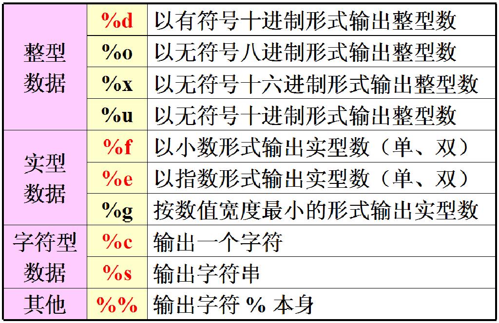 功能:按格式控制所指定的格式,在标准输出设备上输出参数2、…、参数n的值。