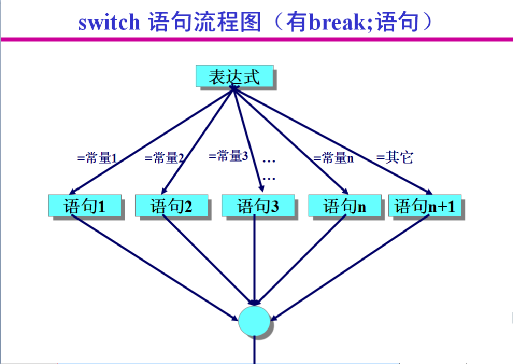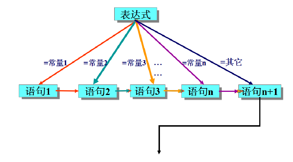 先计算表达式之值,如果与某个case语句中的常量的值匹配(即相同),则执行其后的语句,然后顺序执行下一个case后的语句,不管表达式的值是否与之匹配;若所有的case语句中的常量的值都 不能与之匹配,则执行default后的语句n+1。