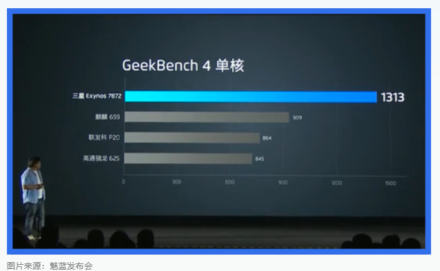手机发布会上的 PPT 图表耍小聪明的真是太多了,小米至少还是基于数据去呈现的图表,下面这张图是就真的是放飞自我了,这是 魅蓝S6 手机新品发布会上介绍处理器的一幕: