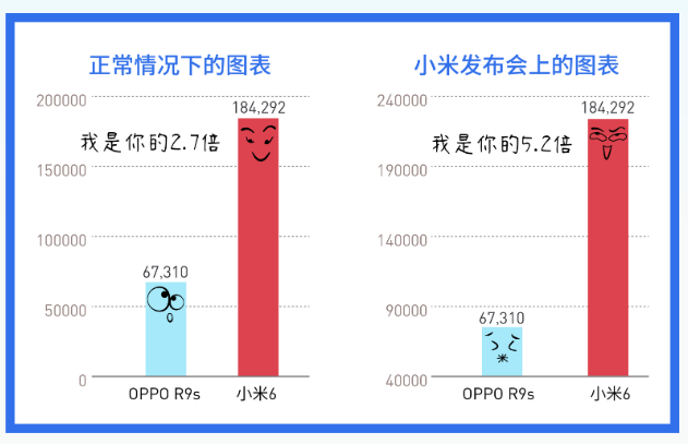 数据上,小米6 的跑分是 18 万多分,而 OPPO R9s 是 7 万分不到,前者是后者的 3 倍不到。而从4万分开始展示,高度给人的视觉感受是双方的倍数有 5 倍多。