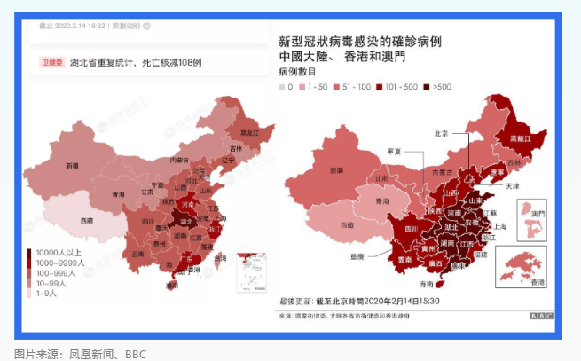 下面这张是凤凰新闻(左边)和 BBC (右边)报道中国新冠确诊人数的地图,数据更新时间都是2020年2月14日的下午。