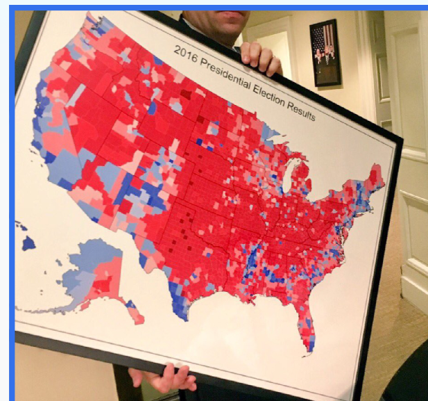 比如书中提到的这幅曾挂在白宫西翼的 2016 年美国大选投票结果地图,就很具有误导性。一眼望去仿佛 80% 都是投特朗普的红色,但实际上他和希拉里得票率都不足50%。