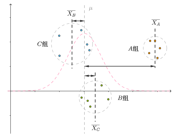 首先需要知道发生了低概率事件,即是否有某组(在本例中是 A 组)的样本均值远离μ 。因为μ是没有办法真正知道的,实际计算时只能用所有样本的均值