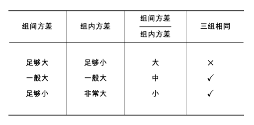 第二行,组间方差一般大,组内方差也是一般大,没有充分的理由相信这三组是不同的,保守一点,我们判断这三组是相同的