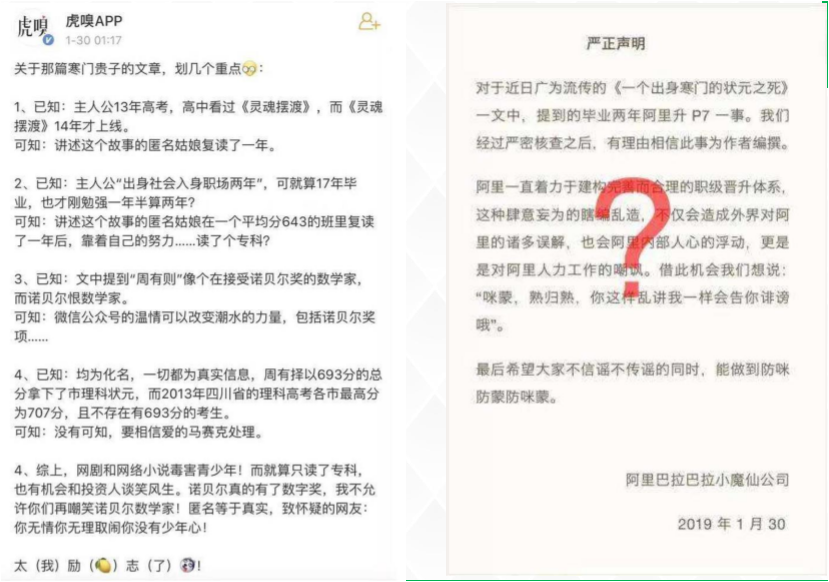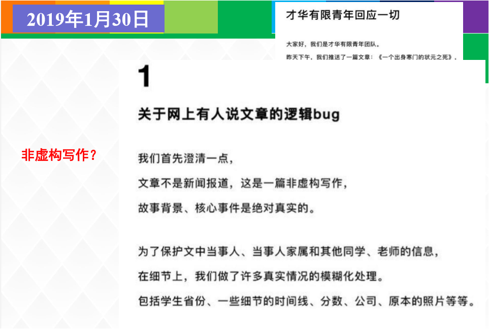 (三)“才华有限青年”公众号回应文章为非虚构写作:文章发表的第二天,这篇文章的作者才华有限青年专门出来回应,“文章不是新闻报道,这是一篇非虚构写作,故事背景、核心事件是绝对真实的。为了保护文中当事人、当事人家属和其它同学、老师的信息,在细节上,我们做了许多真实情况的模糊化处理。包括学生省份、一些细节的时间线、分数、公司、原本的照片等等”。