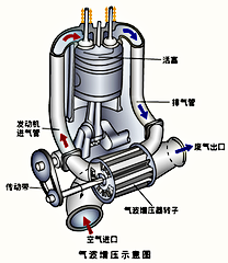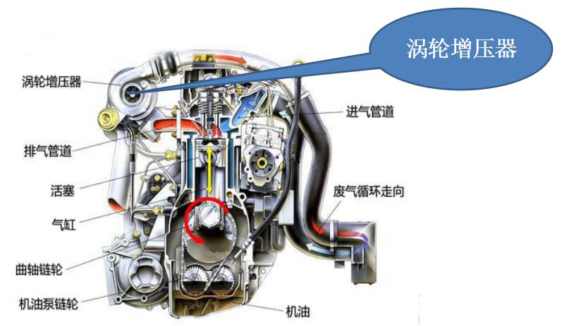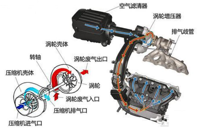 涡轮增压的原理是,利用排出废气的能量冲击排气管道中的涡轮,同时带动进气管的涡轮,使进气增压后送入到气缸,从而提高发动机的功率。