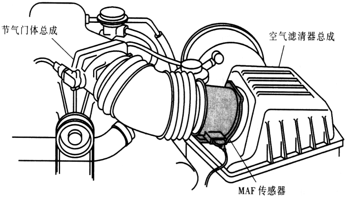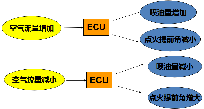 检测进气流量,计算进气量,决定基本喷油量和基本点火提前角。流量增大,喷油增多,点火提前角减小。