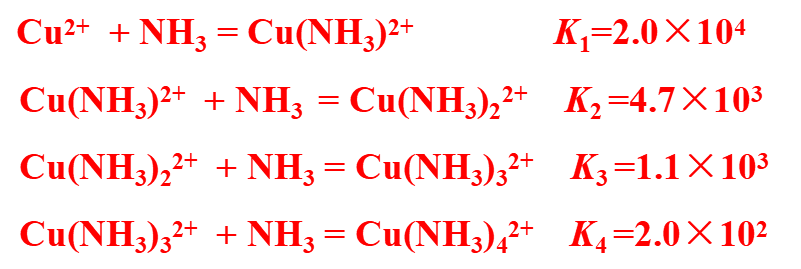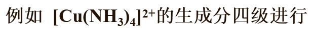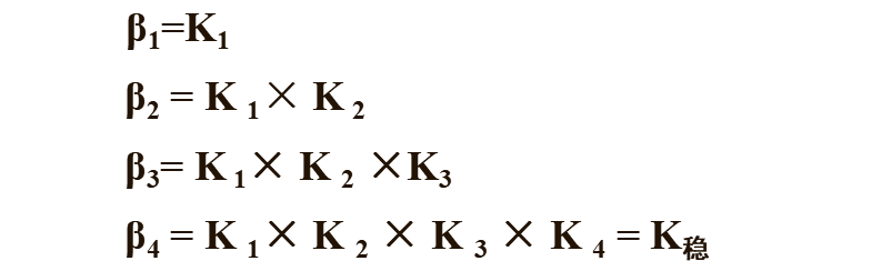 配离子总的稳定常数,也称累积形成常数(常用β表示)等于逐级形成常数的乘积。
