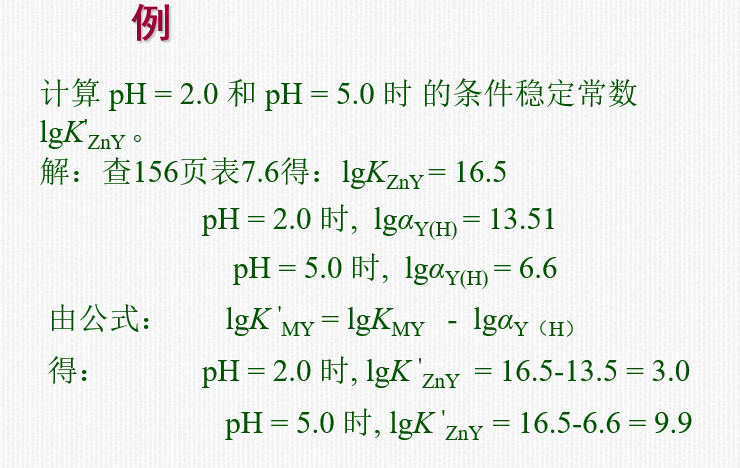 为了方便使用,将一些pH值时EDTA的酸效应系数的对数值lgαY(H)列表(155页表7.5),其他pH值的lgαY(H)值可以采用内插法。