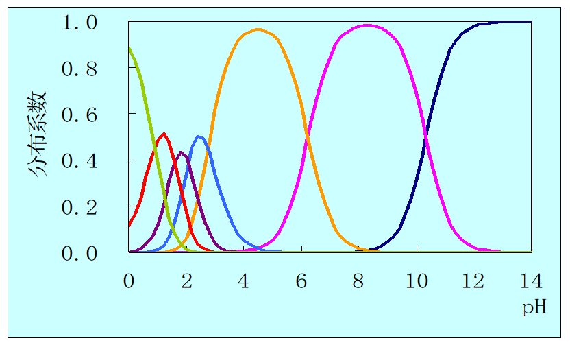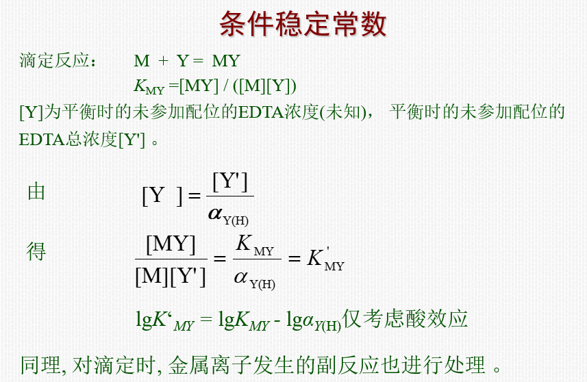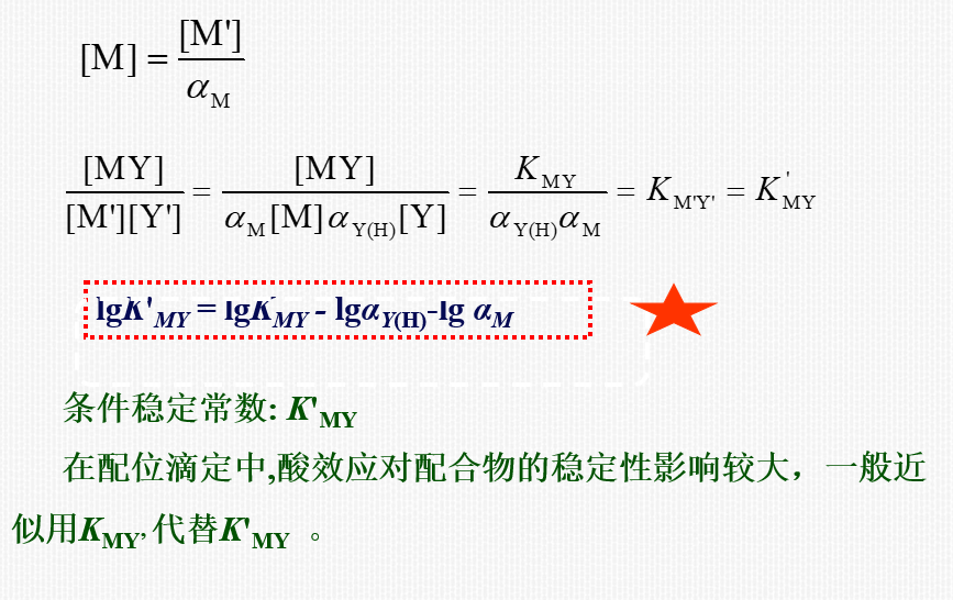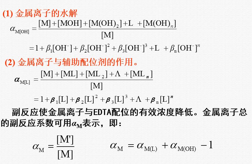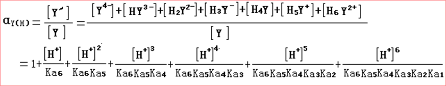 (2)定量衡量:一定pH的溶液中,EDTA各种存在形式的总浓度[Y'],与能参加配位反应的有效存在形式Y4-的平衡浓度[Y]的比值。(注意:酸效应系数与分布系数呈倒数关系)