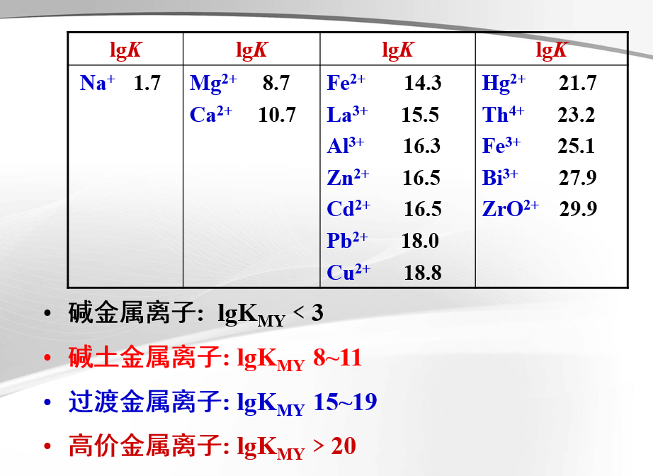 1.配位物的稳定常数(绝对稳定常数KMY)