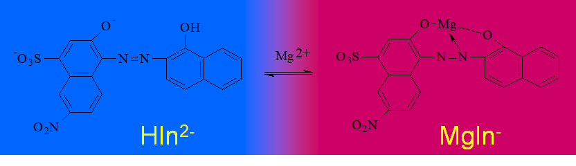 金属指示剂 (也是配位剂)——具有酸碱性质的有机染料,能与金属离子形成明显不同于其本身颜色的有色配位物,