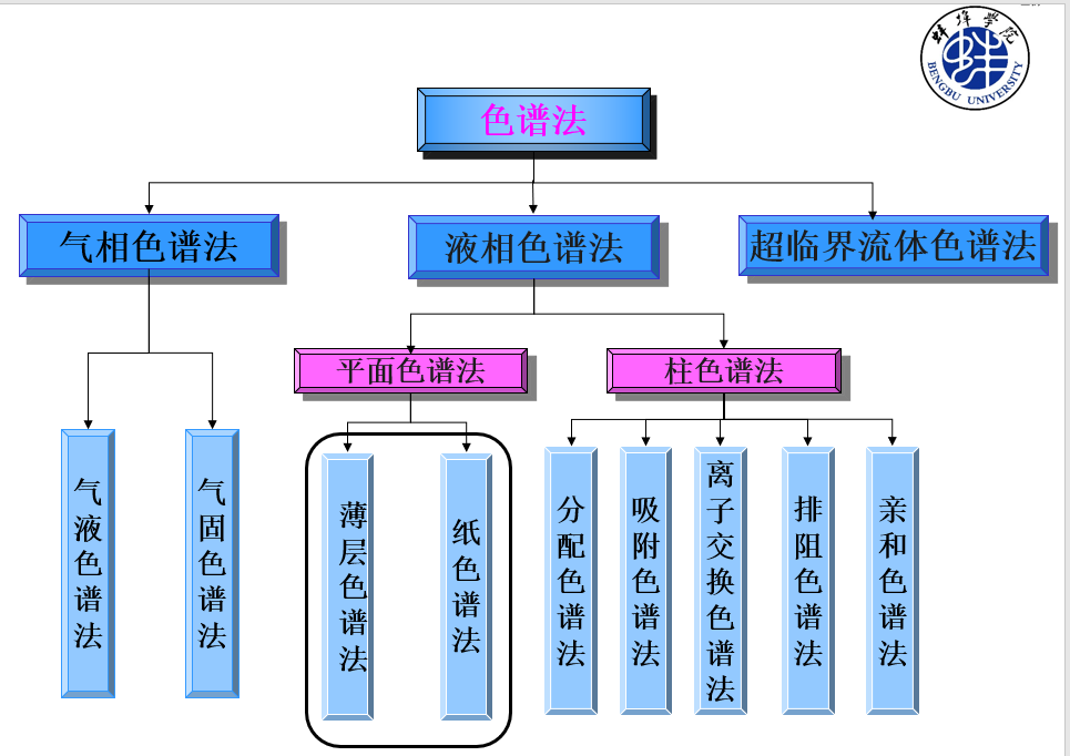 纸色谱:样品点在滤纸上,作为展开剂的有机溶剂在滤纸的毛细管作用下自下而上移动,样品中混合物中各组分在水-有机溶剂两相中发生分配、溶解、再分配,随着有机溶剂的移动而展开,从而达到分离的目的。