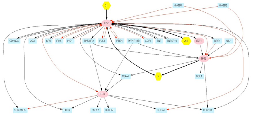 基因通过控制彼此的表达相互作用。这是研究人员绘制出的一个很小的基因调控网络。这里,每个椭圆形或矩形代表一个基因,从一个基因指向另一个基因的箭头表示第一个基因控制着第二个基因的表达。事实证明,人类基因组是由数以千记得像这样的基因彼此以非常复杂的方式进行交互的网络组成,而这种相互作用正是我们人类复杂性的主要来源。