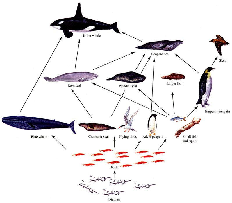 网络中的每个节点都是一个特定的物种群,箭头连线表示捕食关系,箭尾指向的物种是箭头指向的物种的食物。例如蓝鲸捕食磷虾,而又被虎鲸捕食。